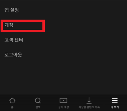 위 사진은 더보기 메뉴 화면입니다. 넷플릭스 시청기록 삭제를 위해서 더보기 메뉴 화면에서 계정을 눌러 계정 메뉴로 들어갑니다.
